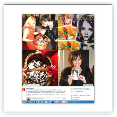 Die Vernissage zur Ausstellung "Woman of the world" am Vorabend zum Weltfrauentag war ein kleines Event mit Musik, Tanz, Modenschauen (Dirndlmode und russische Trachten), einer artistischen Darbietung an der Vertikalstange, mit Wein und kulinarischen Köstlichkeiten. Am Eingang bekam jede Frau die von mir gestaltete Karte "Womenpower" mit einem kleinen Schokoladengeschenk, eine wunderbare Idee der Galeristin Ksenia Petrova-Hufnagl.